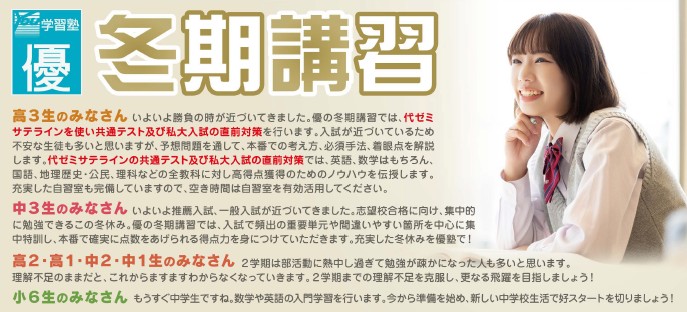 自己を厳しく律した、毎日の積み重ねが自信を生み、自信がやる気を、やる気がまた自信を生み出していきます。学習塾優では、けじめのある厳しい指導を行うことで、毎日の積み重ねをたゆまず続けることができる強い精神力とそこから生まれる自信を養い、生徒ひとりひとりのやる気とファイトを大きく育てる教育を実践していきます。